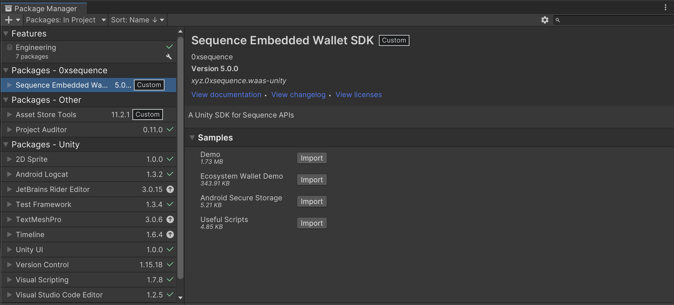 Importe el ejemploEcosystem Wallet Demo desde el Package Manager de Unity. Además, revise nuestro script base