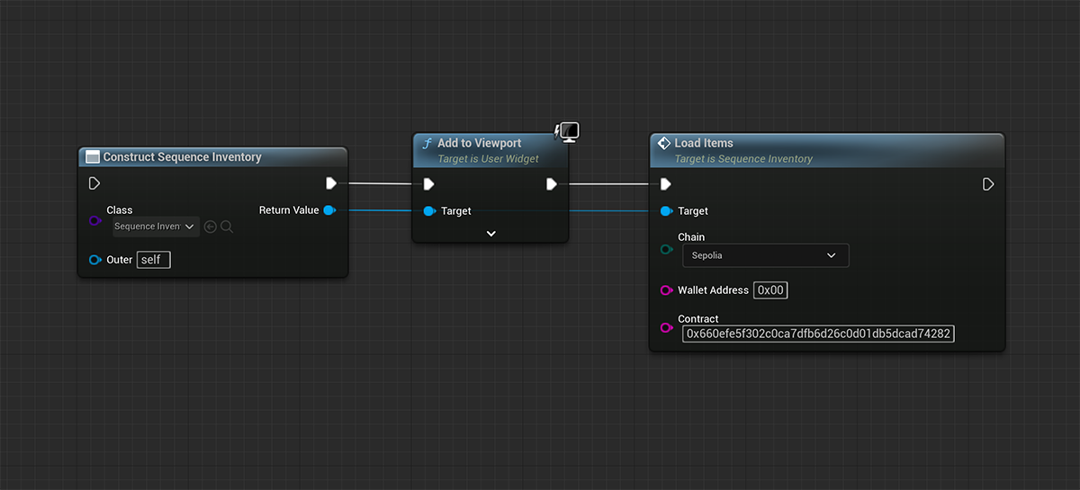 Chain (ENetwork Enum)The chain type (Ethereum, Sepolia, ..) on which the specified contract is deployed.Wallet Address (FString)The wallet address of the user for whom you want to list the inventory items.Contract (FString)The address of an ERC1155 or ERC721 contract where the specified wallet address owns items.