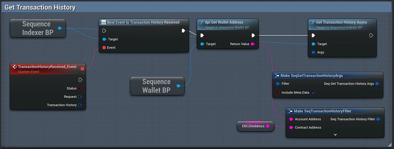 Account Address (FString)Specify a wallet address if you want to receive the history for a specific user.Contract Address (FString)Specify an ERC20, ERC721 or ERC1155 contract address if you want to receive the history for a specific token.Include Metadata (Boolean)Enable this flag if you want to receive token metadata in the response.